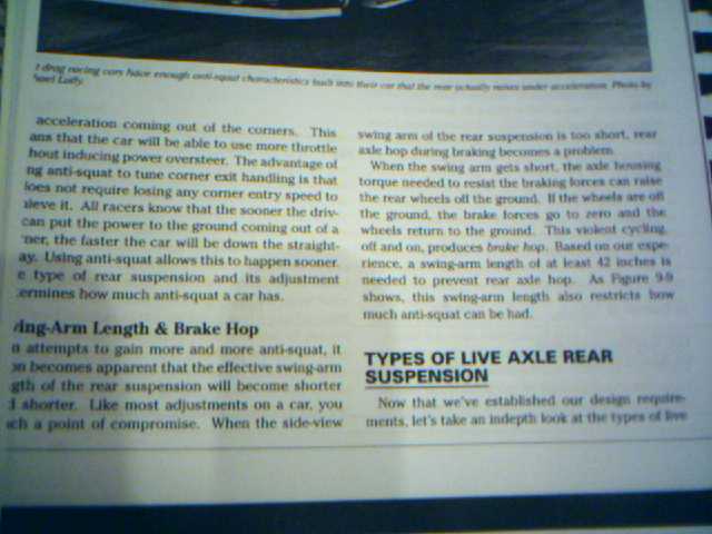 @Jamie, if that is the case then I shouldn't have any wheelhop since my 4link bars are pointing up like in the first drawing. But I think I'll get some cheap traction brackets in a month or so to and see what happens. ![]() And are the rca's ready? I pm'ed you about them. Trying to get my car in a decent shape because my suspension geometry is all over the place... haha
