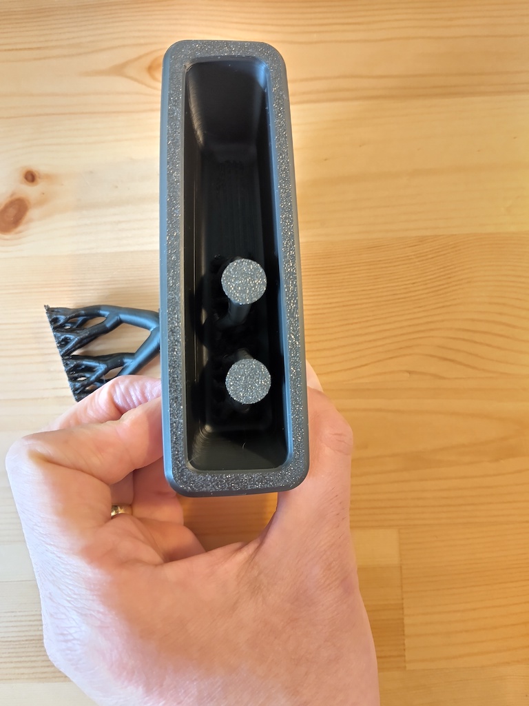 I found a good tutorial on how to create supports with the slicer tool and it's actually quite easy. It's currently printing the same left door-cup and I'll keep my fingers crossed it works.