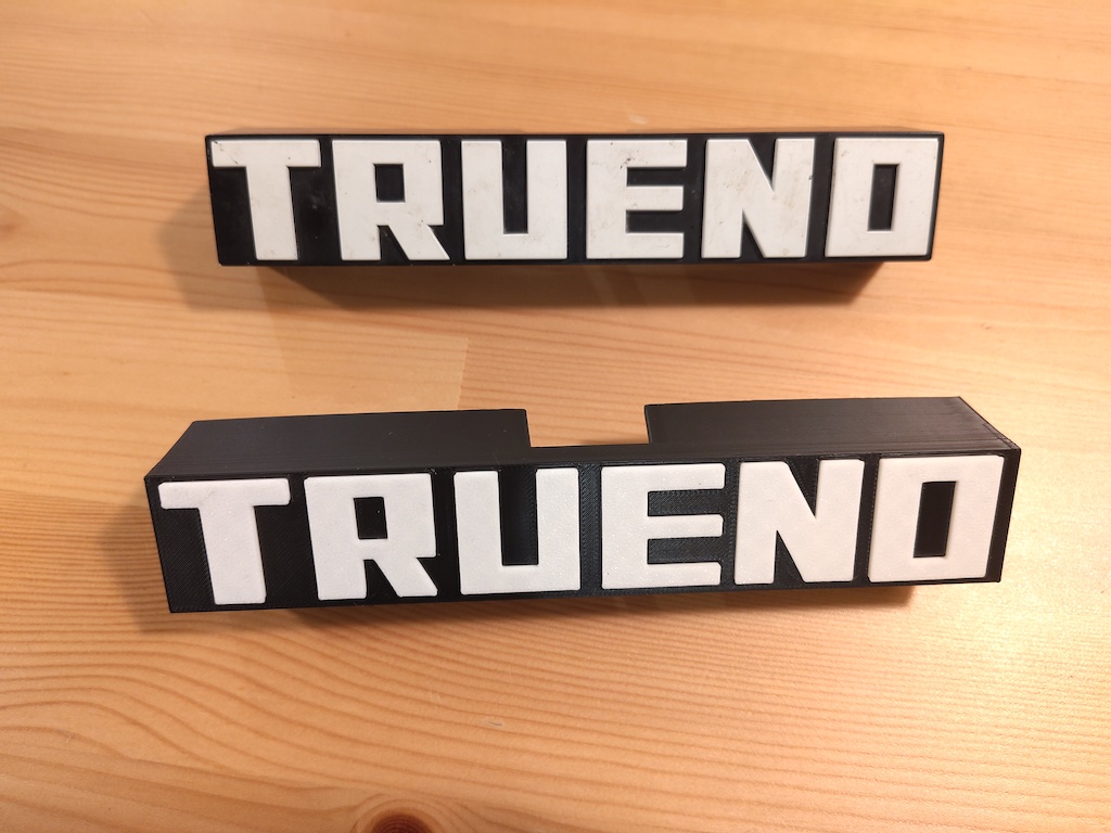 It's becoming more difficult to spot the difference between the original and the copy! ![]() This is the progress I made: The second last from the top are the supports I used for the black holder as I printed it the other way around. I used to print it with the front face down on the plate, but adding supports to that proved to be unreliable. The supports would leave some uneven surface behind and that made the white Trueno characters difficult to fit. So, I decided to turn things around and print it from the back to the front. Up close you can see the difference between the two badges clearly: The printed Trueno characters have a crinkled surface due to the pattern on the printing mat. Apart from that, I'm not dissatisfied! Tomorrow I'll test-fit the printed version to the Trueno to see if everything lines up fine. If that's the case, I'll have it printed in ABS. 1983 - AE86 Sprinter Trueno - import project 2013 - Honda Civic sport - daily driver 2004 - AEU86 dot ORG - daily domain Support our forum, buy from the AEU86 shop: