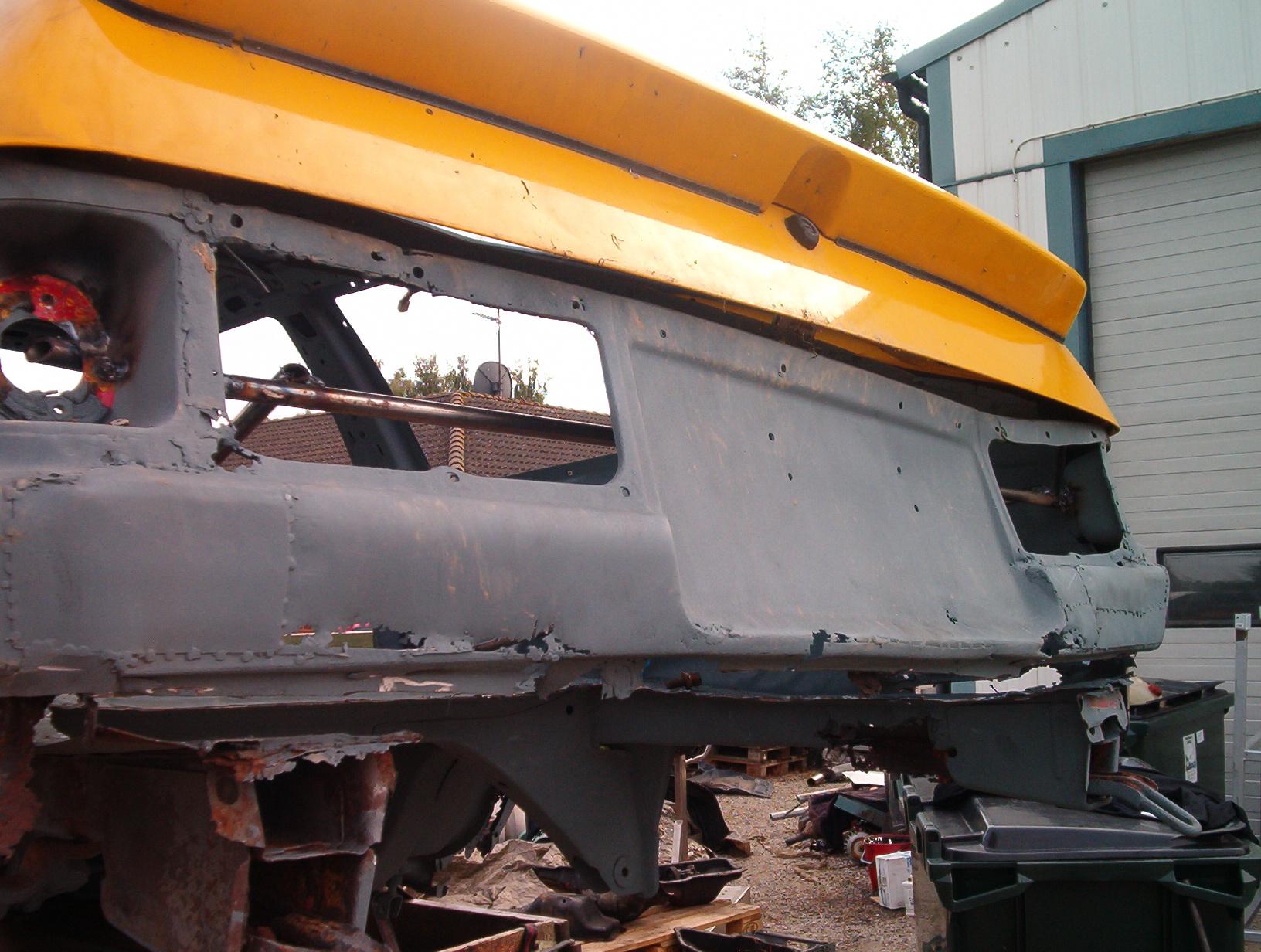 So as you can se the back of the car is gone, this where the only way to go, thanks to bad rust work from the last owner. so hopefully by welding pipes and the back hatch to the chassi it will keep its form.
