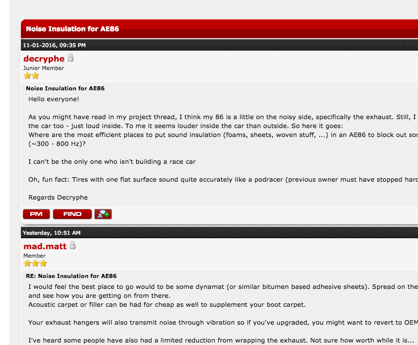 I've also changed the backrgound to a dark-grey color now. It really differs per screen how this is perceived: on a standard monitor it looks very dark, but on my mac it looks very nice. @kjb: I've also fixed the old template. The problem is that I had to install some plugin to do additional logic in this new theme, and that changed some of the conditionals in whether you are allowed to post or not. 1983 - AE86 Sprinter Trueno - import project 2013 - Honda Civic sport - daily driver 2004 - AEU86 dot ORG - daily domain Support our forum, buy from the AEU86 shop: ![]() |