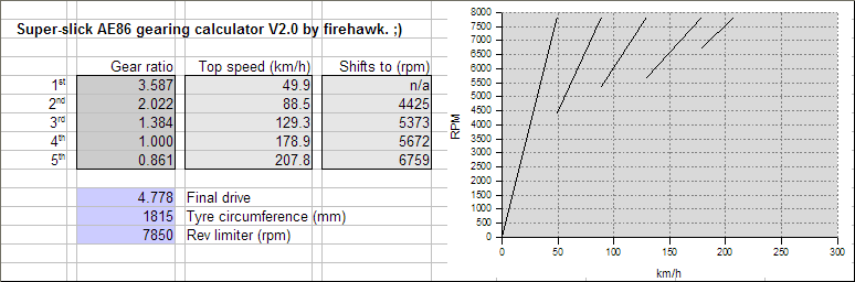On the bright side. my 4.778 final drive kit from SYM arrived! 1st: 46km/h 2nd: 81km/h (~4400rpm=46km/h) 3rd: 119km/h (~5350rpm=81km/h) 4th: 165km/h (~5700rpm=119km/h) 5th: 191km/h (~6800rpm=165km/h) Very nice and tight! The shift from first to second drops the revs a bit low but first gear usually isn't that much needed anyway when driving on a track.If you want to calculate the speeds on different gearings and tyres, here's something I made quickly at work (hahaa); OpenOffice / Excel. Have fun. ![]() I also re-arranged the project image gallery because I had to switch servers - while I was at it, I added some new photos of the current progress; http://www.r5r.net/gallery/v/projects/ae86/ Edit: updated the spreadsheets to new ones that show also the upshift RPMs. |
