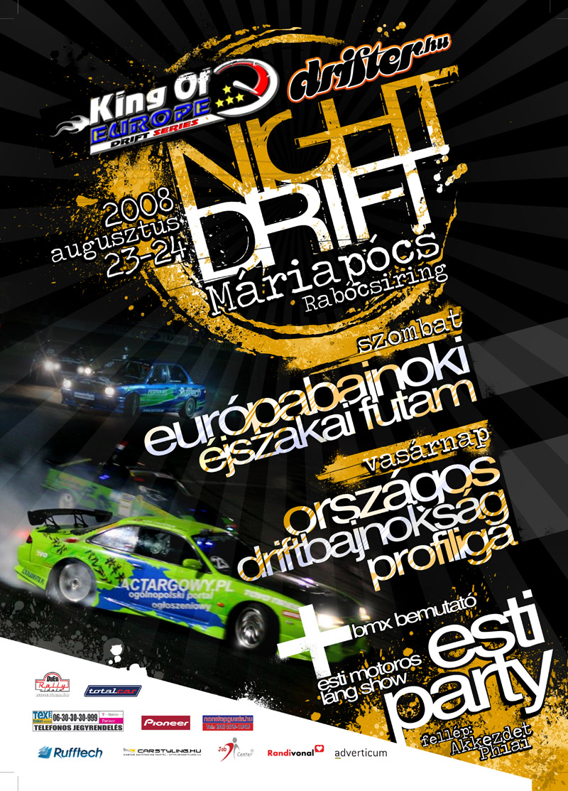 The Hungarian Drift Association would like to invite You to be a part of the 8th round of 2008 King of Europe Drift Series. Here are some informations about the unique Night Drift Race on Máriapócs. The track: The RabócsiRing is Hungary’s most modern and also most visited racetrack. Certified internationally and memorable about last year’s King Of Europe Final with the night tsuiso drift event. The longitude is 910 meters, width between 10 and16 meters. On the race, 5 corners will be under valuation, the 4th and 5th is a left turn with three angles, and the surface has an angle too, like oval tracks. The parking lot for the racers has electricity, 220v, toilets and showers especially for those who sleeps in campers or in tents. The whole place are under non stop surveillance of a professional guarding team. Entry cost: We count with about 50 drifters (there is a max limit of 50 drivers). Training - Friday (22nd August): 30€ or 7.000,- HUF KoE night drift race – Saturday (23rd August): 50€ or 12.000,- HUF Team Drift race – Sunday (24th August): Free Online registration: http://www.drifter.hu Tyre mounting is free for the registered racers, as alwalys! Any racer can get two more person to enter free, as a helper, serviceman or family, and one vehicle as a service car. Price of admission for spectator: Training - Friday: Free KoE night drift race – Saturday: 10€ or 2.500,- HUF Hungarian Drift Series and Team Drift race – Sunday: 8€ or 2.000,- HUF Time schedule: Friday (Training) 09.00-16.00: Admin open for registration 09.45: Briefing 10.00-13.00 Training 13.00-13.30 Brake 13.30-18.30 Training Saturday: (KoE) 09.00-09.45 Open for registration, and technical check 09.45-10.00 Briefing 10.00-13.00 Training 13.15-14.00 Drift Taxi 14.00-14.30 Break (Exclusive girl car wash) 14.30-15.00 Open ceremony - pageantry 15.15-16.15 Qualification Group 1 16.30-17.00 BMX stunt show 17.15-18.15 Qualification Group 2 18.15-18.45 Drift Taxi 19.00-19.15 Tsuiso Briefing and result annunciation 19.15-20.30 Top32 tsuiso 20.30-21.00 Streetfighter Fire show 21.15-23.00 Top 16/8/4 and the Final 23.00-23.15 Award ceremony 23.15-24.00 Concert: NaTo, Akkezdet Phiai 00.00-02.00 Party - DJ Sunday: (HDA and Team Drift) 10.00-10.30 Open for registration, and technical check 10.30-12.00 Training 12.00-12.30 Drift Taxi 12.30-13.00 BMX stunt show 13.00-13.15 Briefing 13.30-14.00 Open ceremony - pageantry 14.00-17.00 HDA Tsuiso Top32/16/8/4 and Final 17.00-17.30 Break, Team drift briefing 17.30-18.30 Team Drift 18.30-19.00 Award ceremony KoE Awards: Winner: Cup + 300 euros in cash + 300 euros in KW coupon rebate Second place: Cup + 200 euros in cash + 200 euros in KW coupon rebate Third place: Cup + 100 euros in cash + 100 euros in KW coupon rebate Press information: Accreditation (for media, press, photo) is only before the event! To enter free, must be at the gates before 10am on the day of the race. For working on the racetrack, must wear the H.D.A. visibility vest. The vest is free, caution for using is 5000 HUF or 20 euros. Send a mail to: [email protected] with all the information about the represented media. The Hungarian Drift Association have again (as always) a professional video (XPROVID Film) and photographer team! If ANY questions please do not hesitate to call or write us Best regards: Hungarian Drift Association ![]() +36 70 250 7777 [email protected] ![]() Volvo 242 GLT Turbo Volvo 440 1.8i |