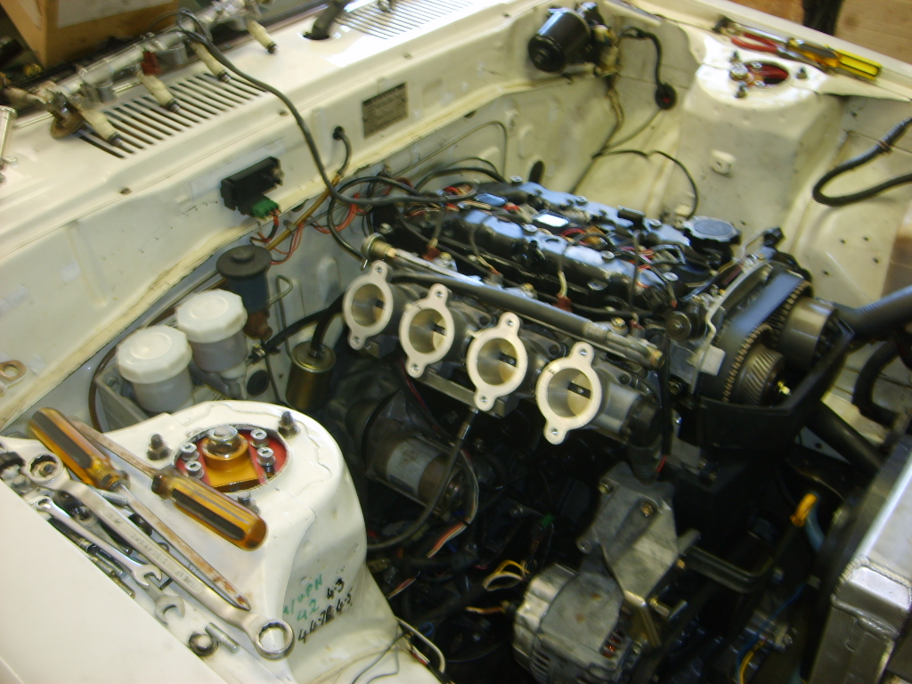 has AP discs front and rear with 4 spots on the front and 4 spots on the rear the car weighs in at 998 kilos before i get in and retains most of the interior as per our rules ,but we are able to take out back seat for roll cage and heating etc ,but must retain headlining and passenger seat the motor in the last set of pics with curved ram tubes is the current set up running 14.5 to 1 comp cams are 14.65 mm of lift 1 tooth of vvti on each cam 50mm quad throttles with 2 stage injection and big air box current power is 204 kws at back wheels at 9200 rpm and motor idles at 900 rpm |
